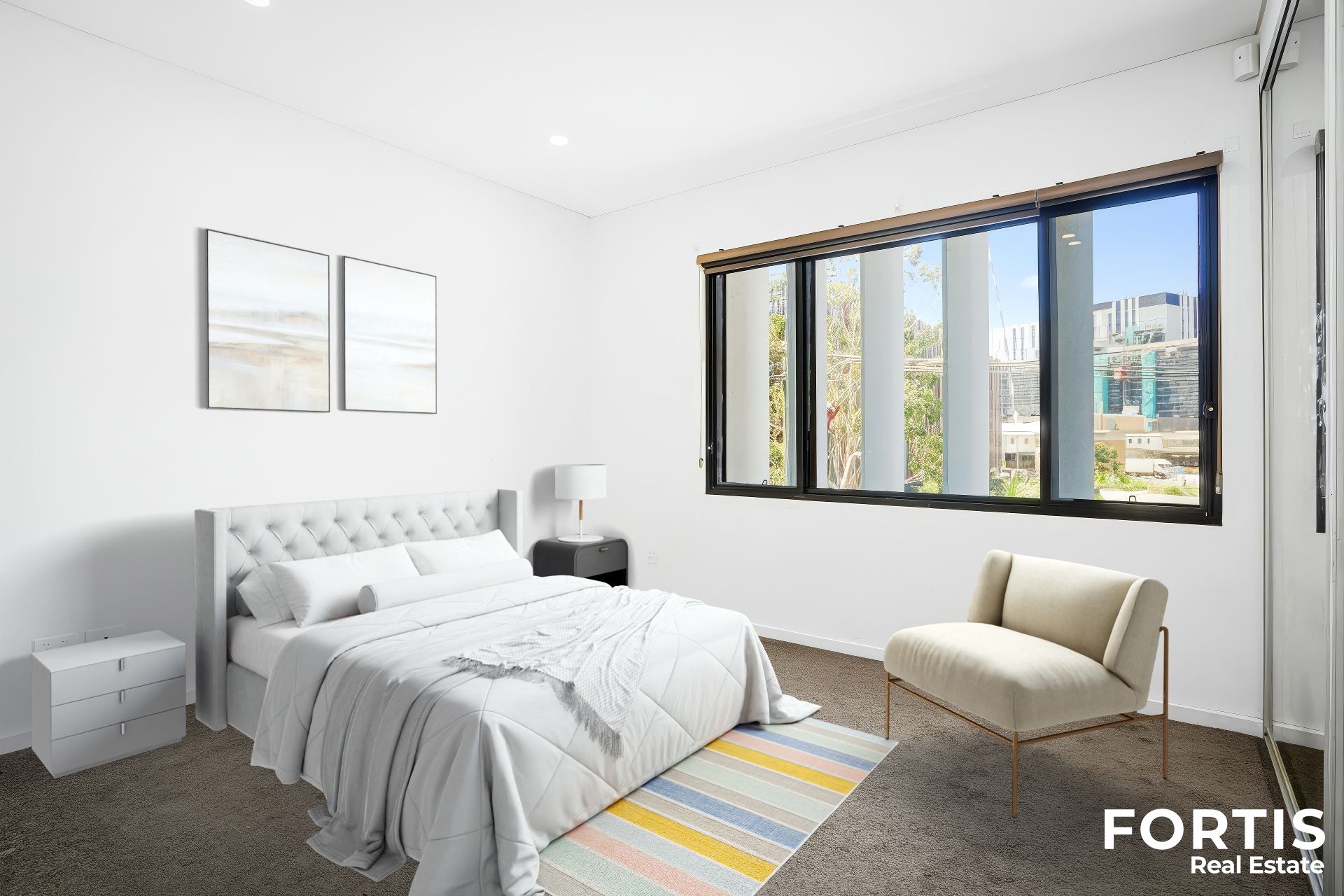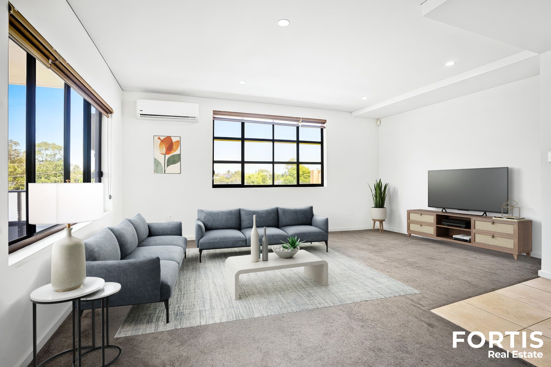 • Split system air conditioning, soft carpet, day and night roller blinds and modern lighting.